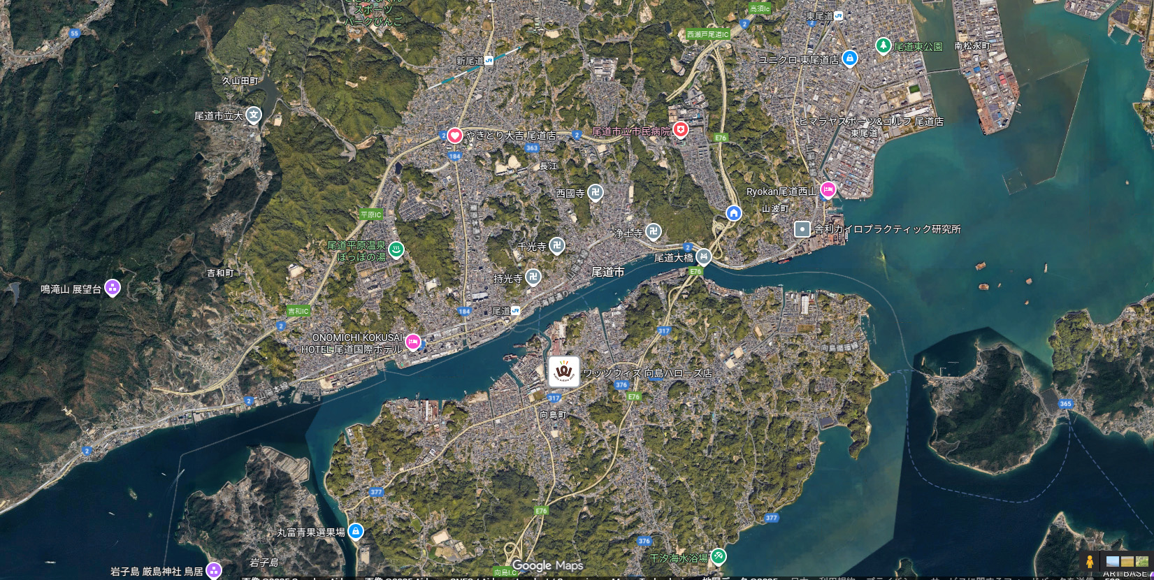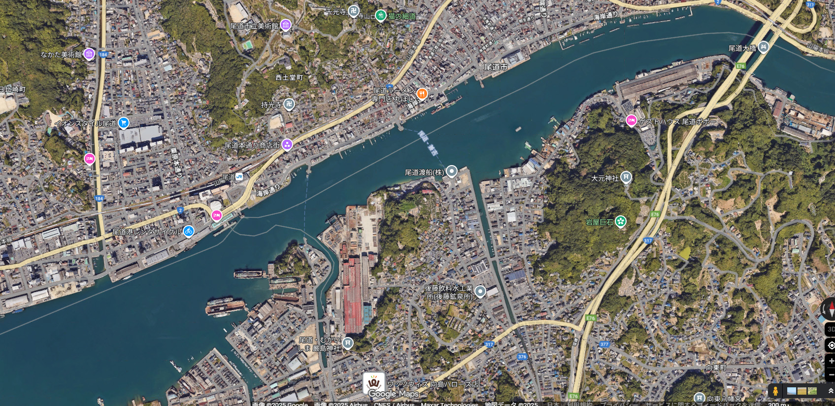 空から眺めれば、穏やかな海と連なる島々、山の斜面に寄り添うように広がる家並みが美しい風景を描きます。